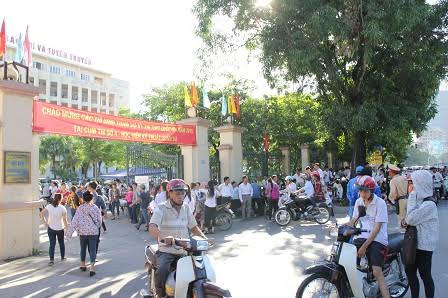 Tâm trạng lo lắng thể hiện rõ nhất của phụ huynh nhất là khi trống trường điểm kết thúc giờ làm bài. Lúc này, mặc cho cái nắng chói chang của Hà Nội trong mấy ngày nắng nóng đỉnh điểm, nhiều người bắt đầu nhốn nháo, đứng kín cả cổng trông ngóng, cố gắng nhìn vào bên trong sân trường để chờ con ra.