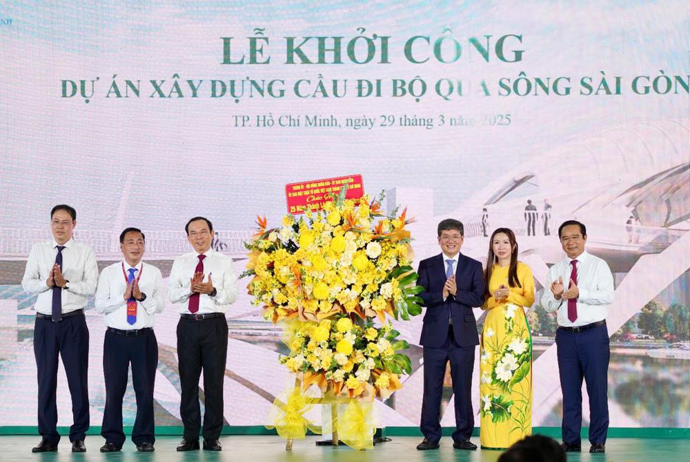 Lãnh đạo TP HCM chúc mừng khởi công dự án xây dựng cầu đi bộ qua sông Sài Gòn. |
