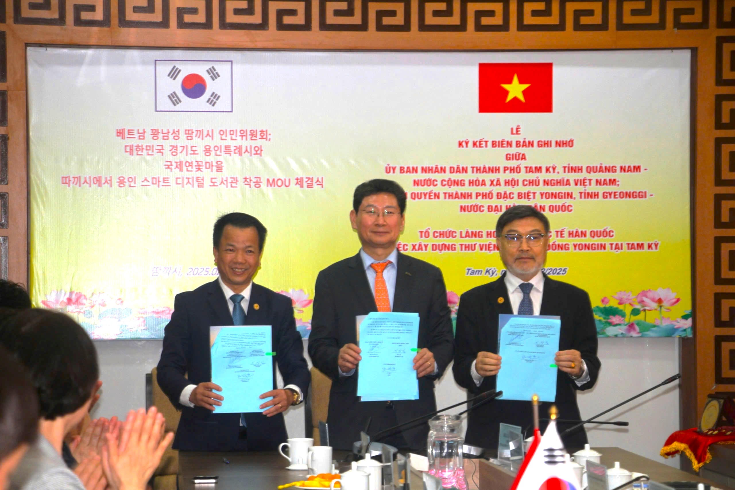 Nhân chuyến thăm, Đoàn đại biểu lãnh đạo thành phố Yongin đã có buổi làm việc với TP Tam Kỳ. Tại buổi làm việc, hai bên đã ký biên bản ghi nhớ hợp tác. Đặc biệt, TP Yongin sẽ hỗ trợ TP Tam Kỳ xây dựng thư viện số cộng đồng Khu phức hợp phúc lợi giáo dục Làng Hoa sen Quốc tế Hàn Quốc (phường An Phú).