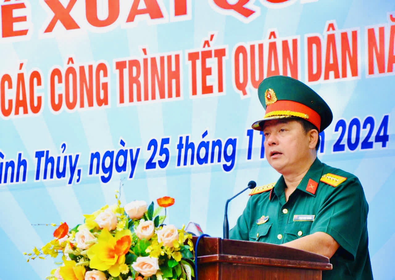 Đại tá Phạm Ngọc Quang - Chính ủy Bộ Chỉ huy quân sự TP Cần Thơ phát biểu tại lễ xuất quân thực hiện các công trình Tết Quân Dân năm 2025. |