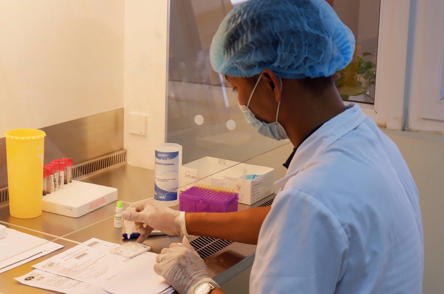 | Kỹ thuật viên thực hiện các thao tác xét nghiệm tại Bệnh viện Bệnh Nhiệt đới Trung ương. Ảnh: Quốc Toàn. |