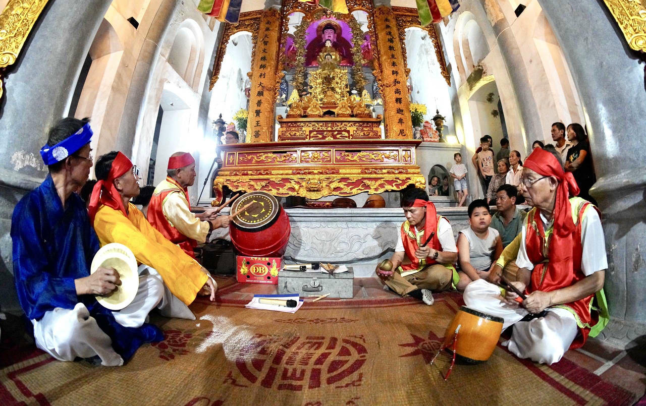 Tại chính cung, Hội Chầu rối cung nghinh Đức Thánh Tổ được tổ chức độc quyền bởi Phái 2- Ngành 2- Họ Nguyễn Đại Tộc (ảnh: Bùi Tuấn) |