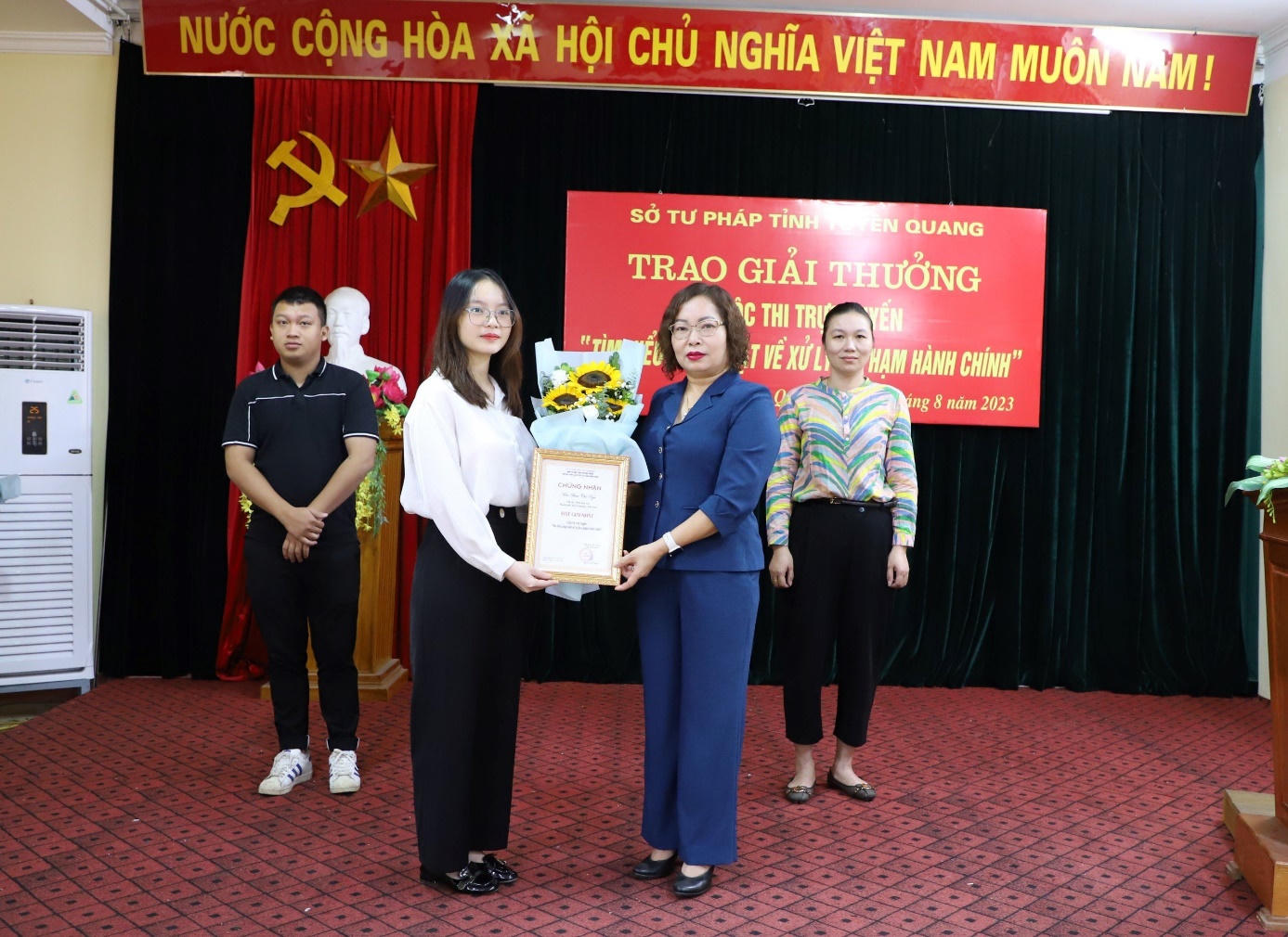 Giám đốc Sở Tư pháp tỉnh Tuyên Quang Nguyễn Thị Thược trao giải Nhất cuộc thi “Tìm hiểu pháp luật về xử lý vi phạm hành chính” trên địa bàn tỉnh năm 2023 (ảnh STP Tuyên Quang). |