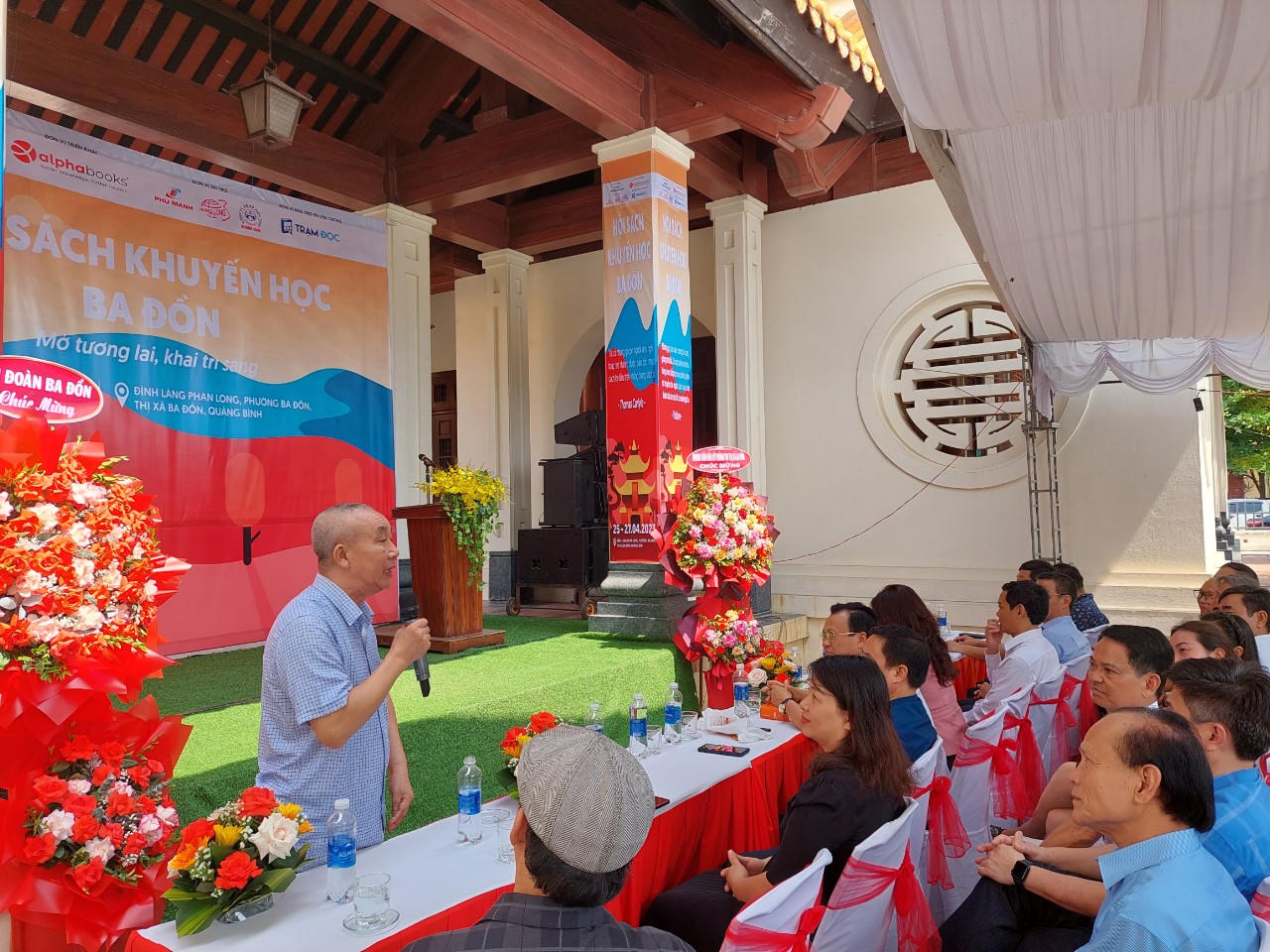 Nhà văn Nguyễn Quang Lập phát biểu chia sẻ về văn hóa đọc tại Hội sách khuyến học Ba Đồn. |
