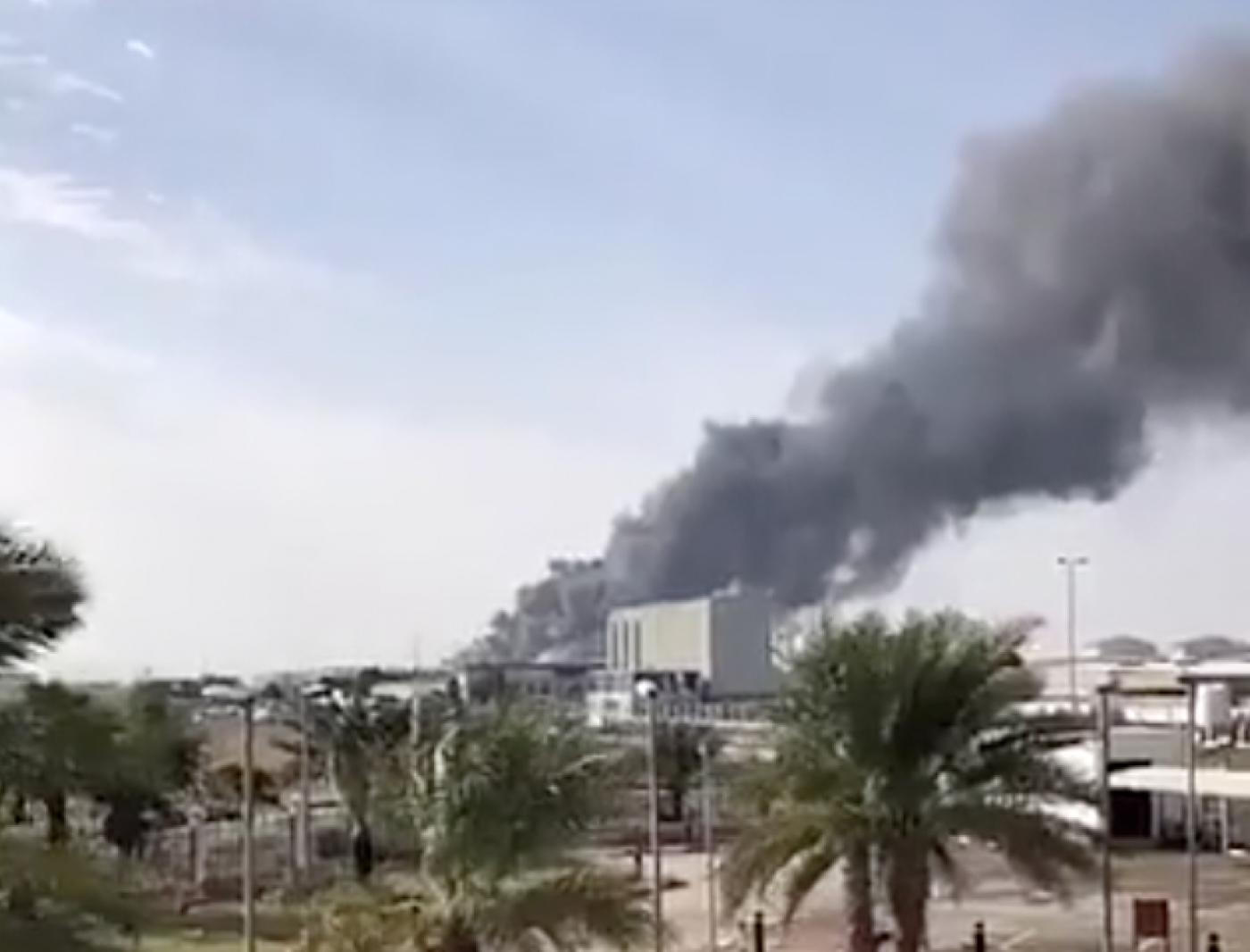 Hình ảnh đám khói đen dày đặc được cho là bốc lên từ khu vực Musaffah, sân bay tại thủ đô Abu Dhabi (ảnh trên mạng xã hội).