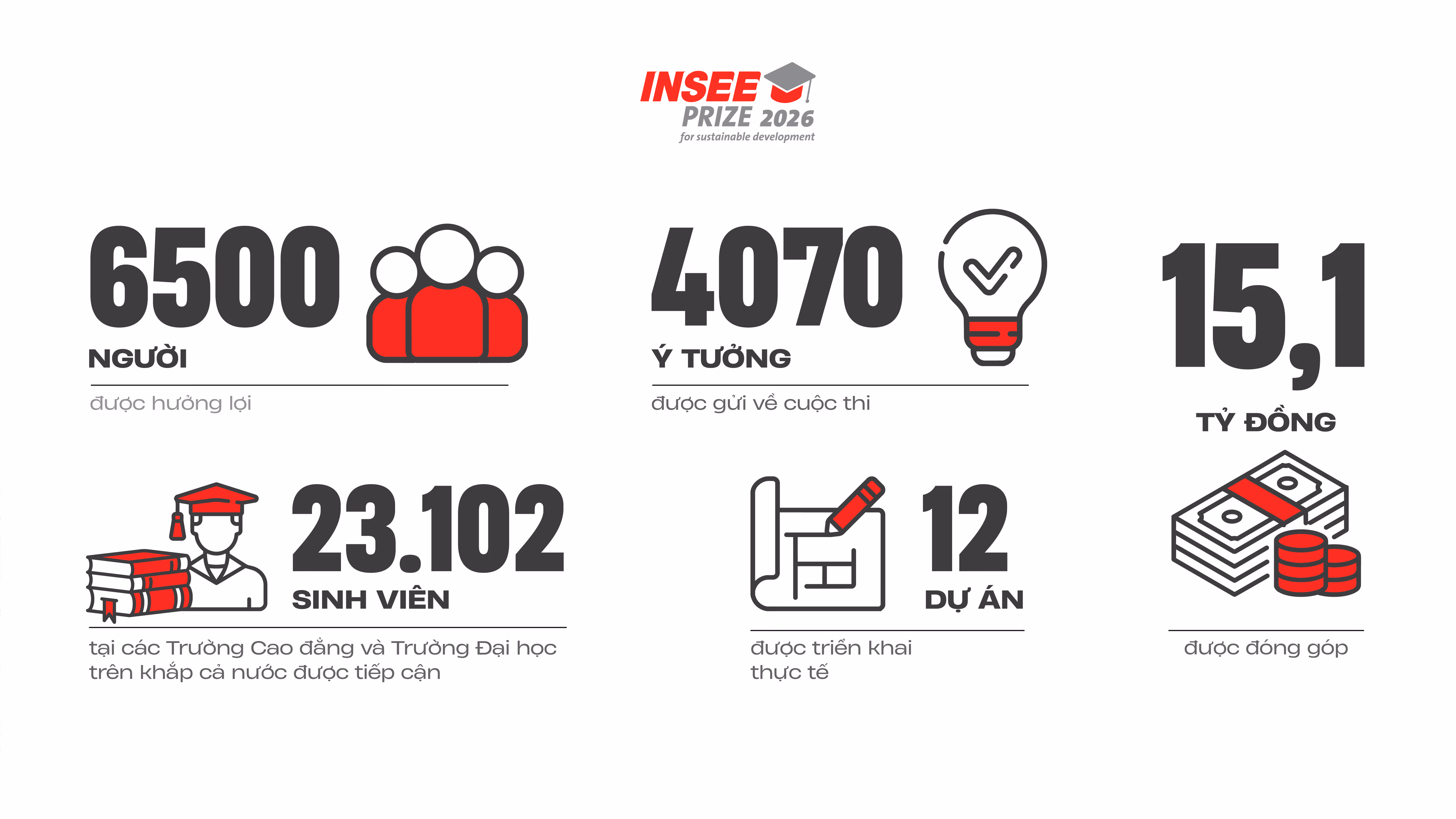 Tính đến nay, cuộc thi đã hiện thực hóa 12 công trình, mang lại giá trị cho khoảng 6.500 người hưởng lợi, tiếp cận 23.102 sinh viên trên toàn quốc và ghi nhận 4.070 ý tưởng dự thi. Những con số này cho thấy sức lan tỏa của chương trình, đồng thời phản ánh niềm tin mà INSEE Prize đã xây dựng trong cộng đồng sinh viên, giảng viên và giới chuyên môn suốt gần hai thập kỷ qua.