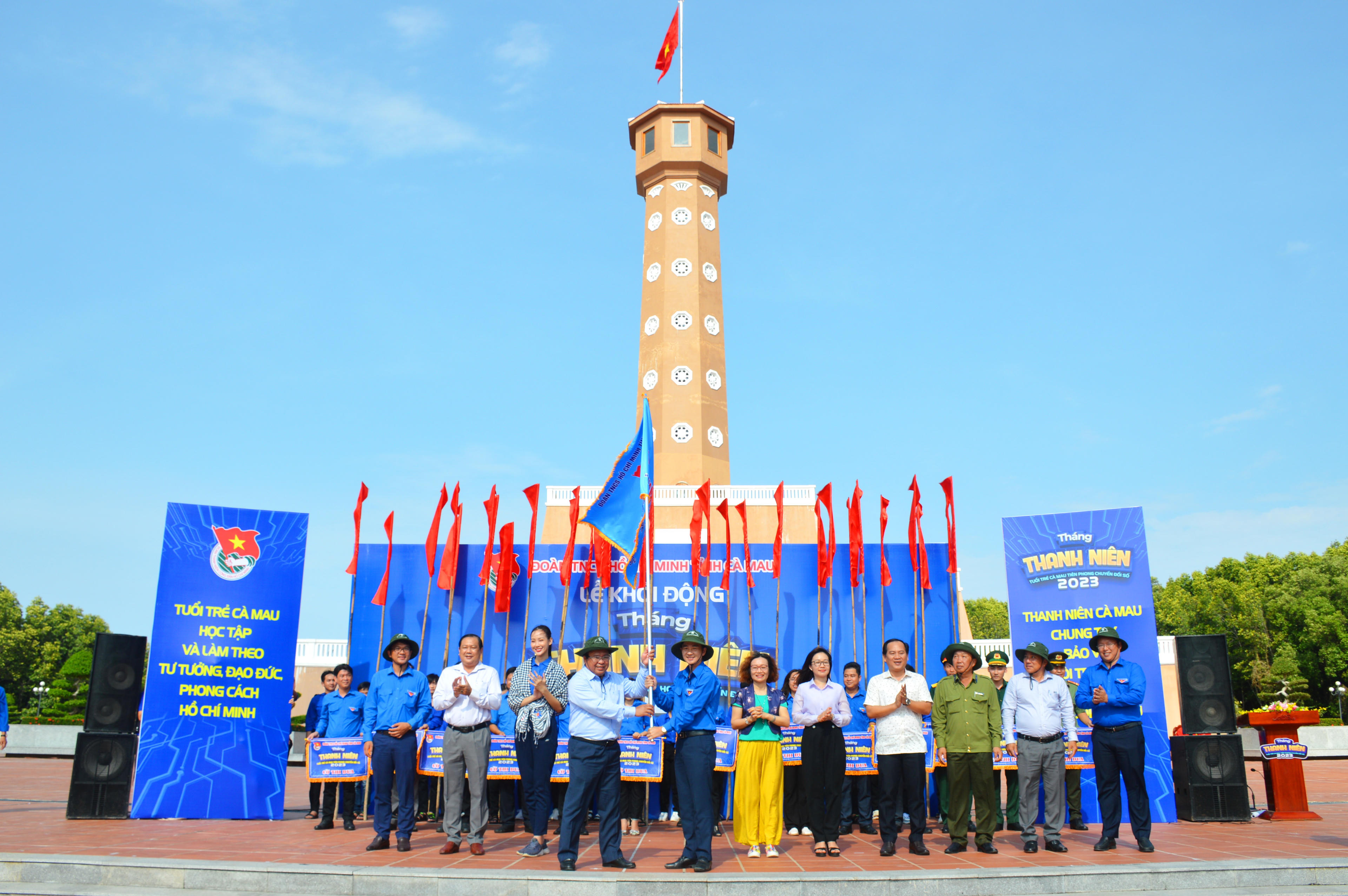 Ông Nguyễn Minh Luân - Phó Chủ tịch UBND tỉnh Cà Mau trao cờ ra quân Tháng thanh niên cho anh Nguyễn Hoàng Đạo – Bí thư Tỉnh đoàn Cà Mau. |