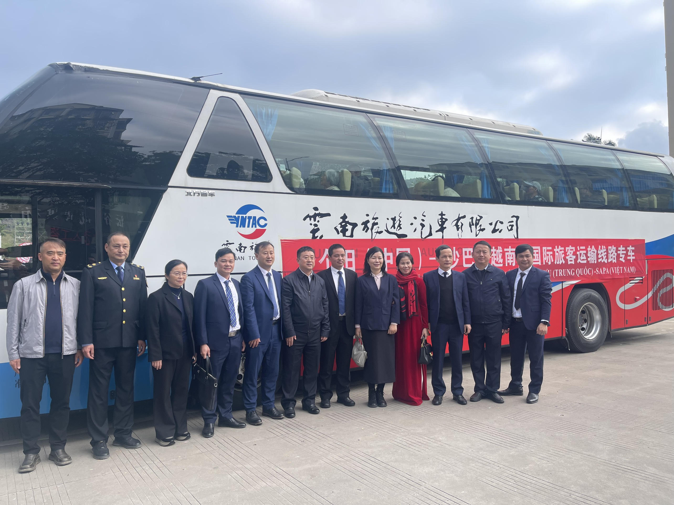 Sau lễ thông xe, hai bên tổ chức đón đoàn khách du lịch đầu tiên tham gia tuyến vận tải hành khách không định kỳ xuyên biên giới Việt Nam - Trung Quốc.