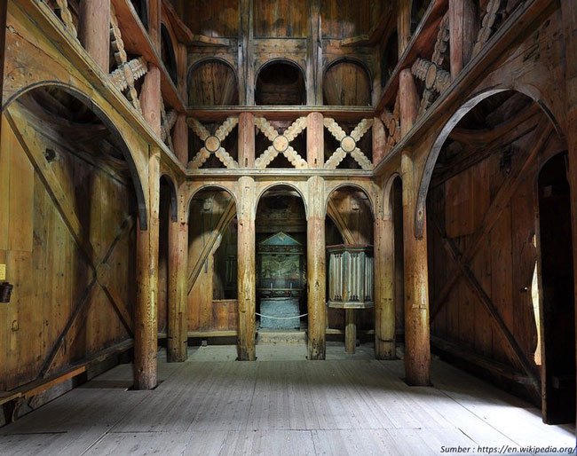 Bên trong nhà thờ, hầu hết được làm bằng gỗ, tồn tại từ lâu nhưng ko hề hư hao và mục, mà rất vững chắc. Màu gỗ tuy đã cũ vài chỗ bị tróc sơn theo thời gian tuy nhiên đa phần còn nguyên vẹn những hình thù được người nghệ nhân Viking điêu khắc tạc nên.