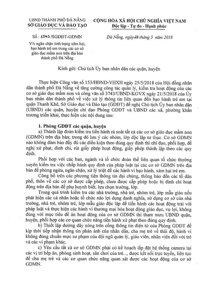 Cũng liên quan vụ việc, chiều 28/5, ông Nguyễn Đình Vĩnh, Giám đốc Sở Giáo dục và Đào tạo Đà Nẵng đã gửi công văn yêu cầu Phòng Giáo dục quận, huyện thiết lập đường dây nóng tiếp nhận thông tin bạo hành trẻ tại cơ sở mầm non.