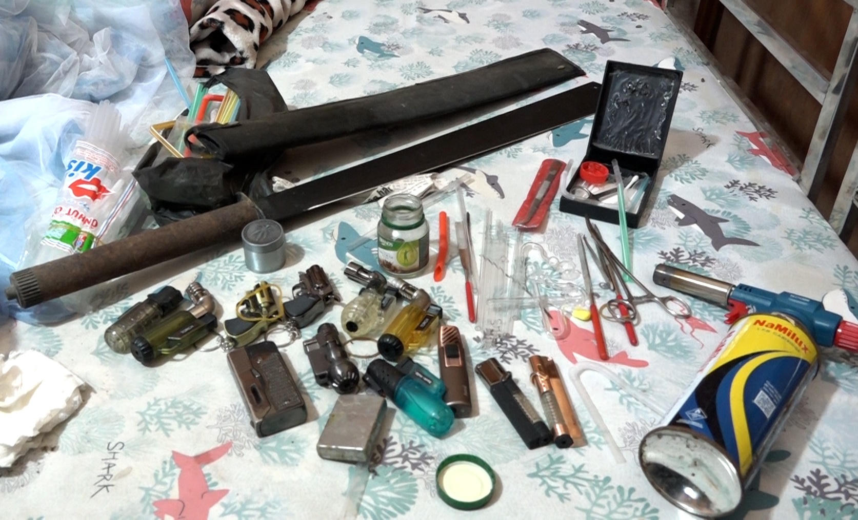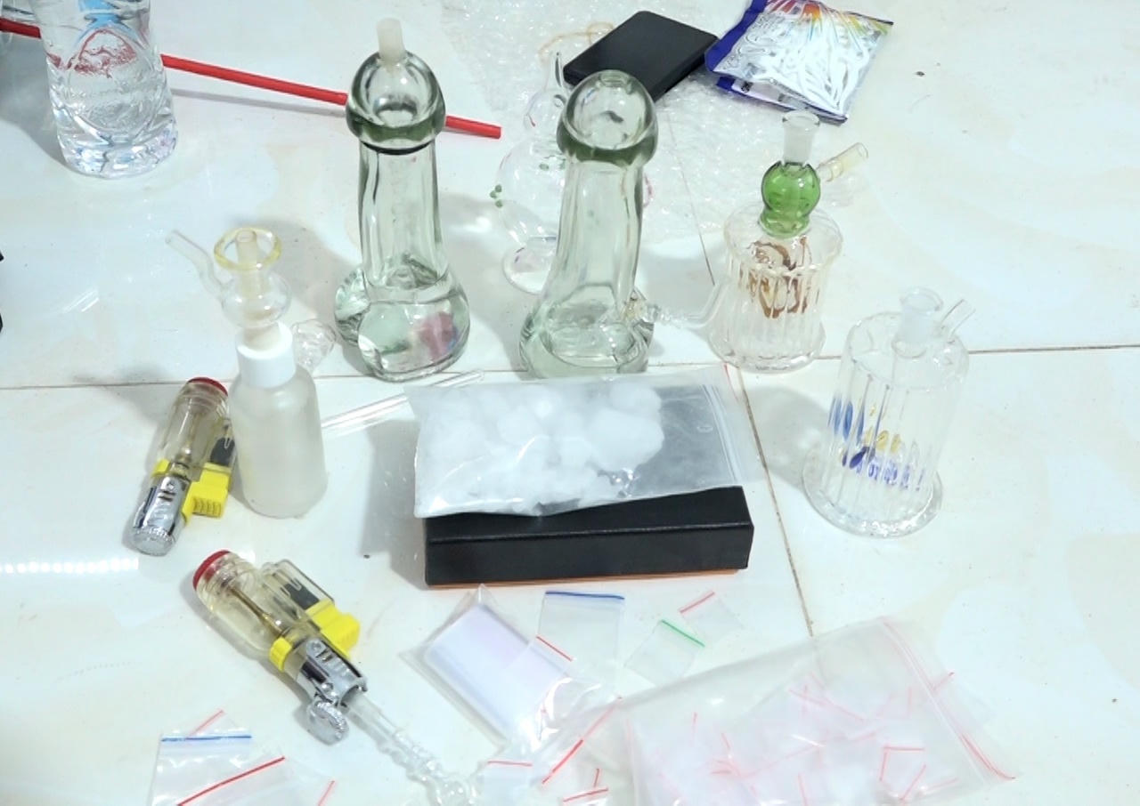 Tại hiện trường, lực lượng Công an thu giữ 02 bọc nylon trong suốt chứa ma túy đá bên trong, 12 viên ma túy, 2 dao tự chế và nhiều tang vật có liên quan khác. Tiến hành khám xét nơi ở của đối tượng Nhiệm trên bè cá đang neo đậu tại ấp Long Hòa, xã Long Thuận, huyện Hồng Ngự, tỉnh Đồng Tháp, lực lượng Công an tiếp tục thu giữ 01 bọc nylon chứa ma túy đá bên trong. Tổng khối lượng ma túy thu giữ là: 53,2954gam.