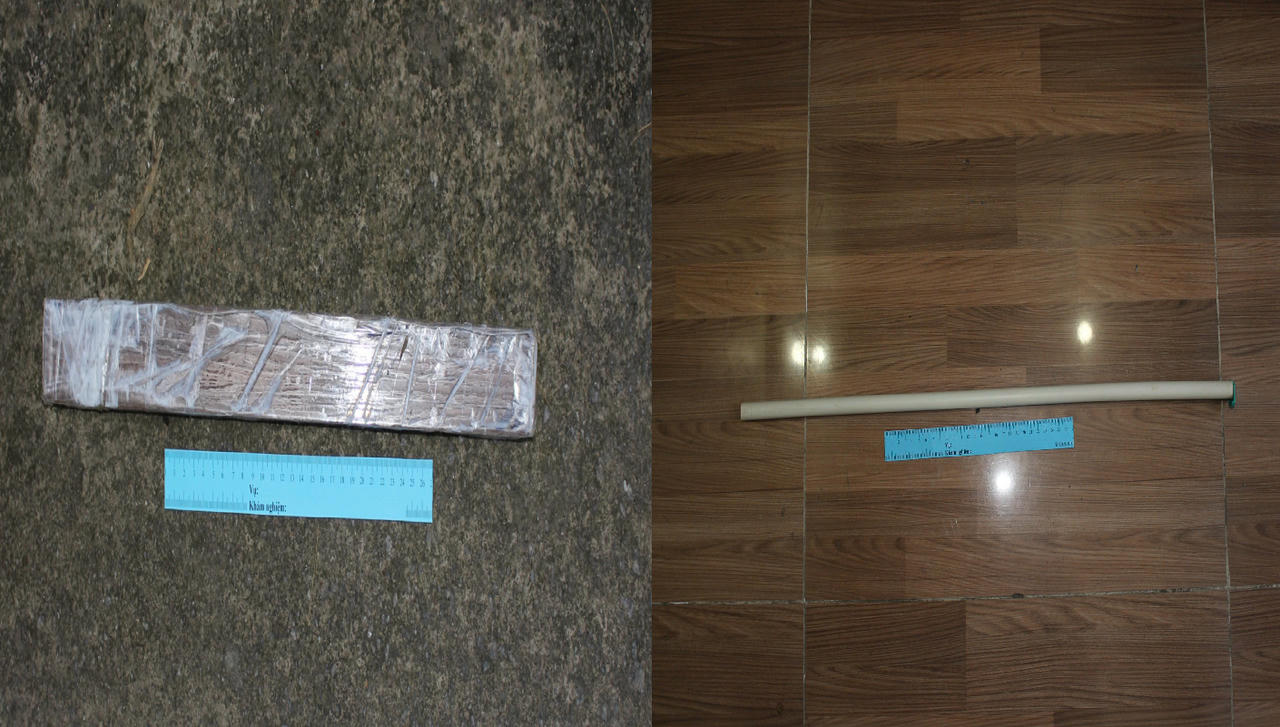 Tại hiện trường lực lượng Công an thu giữ một tấm ván gỗ dài 45,5 cm, một ống nhựa màu trắng dài 66,5 cm. Giang khai nhận đã sử dụng hai vật này để đánh bé D.T.