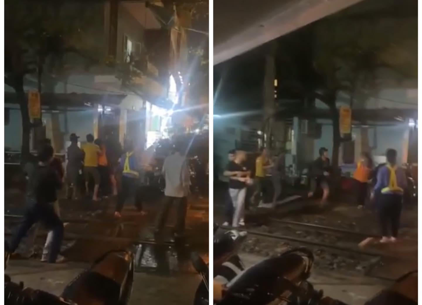 Hình ảnh nhóm côn đồ hành hung nhân viên gác chắn được người dân quay lại. |