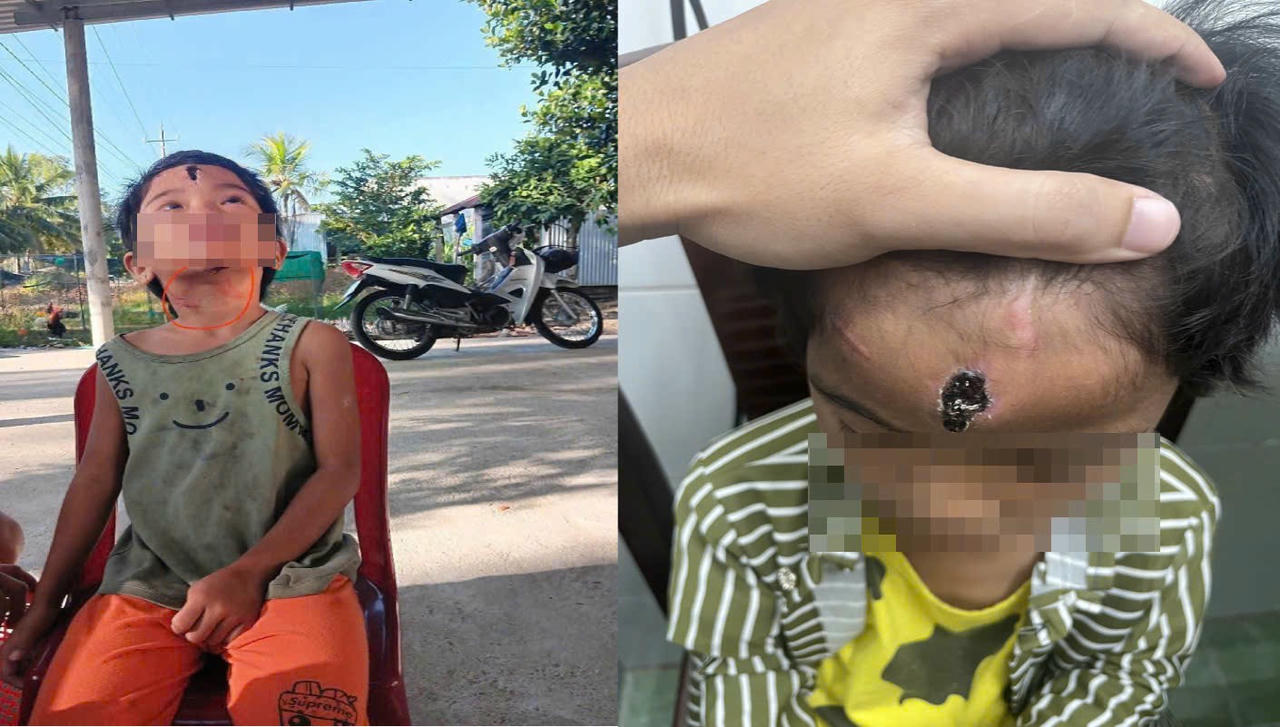 Vết thương trên trán cháu N.T.N. do bị cha dượng đánh đập |