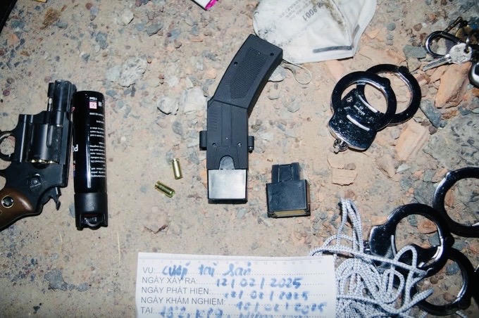 Lực lượng công an lập tức truy đuổi và khống chế thành công đối tượng. Tang vật thu giữ gồm: một khẩu súng ổ xoay (kiểu dáng Rulo), 7 viên đạn (5 viên trong súng, 2 viên trong giỏ), một bình xịt hơi cay, 3 khóa số 8, một súng bắn điện, một con dao, một đoạn dây dù và một cuộn băng keo.