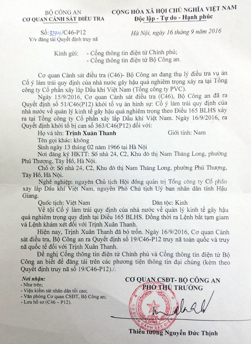 Ngày 16/9/2016, Cơ quan Cảnh sát điều tra, Bộ Công an đã ra Quyết định truy nã Trịnh Xuân Thanh, nguyên Chủ tịch Hội đồng quản trị Tổng công ty PVC.