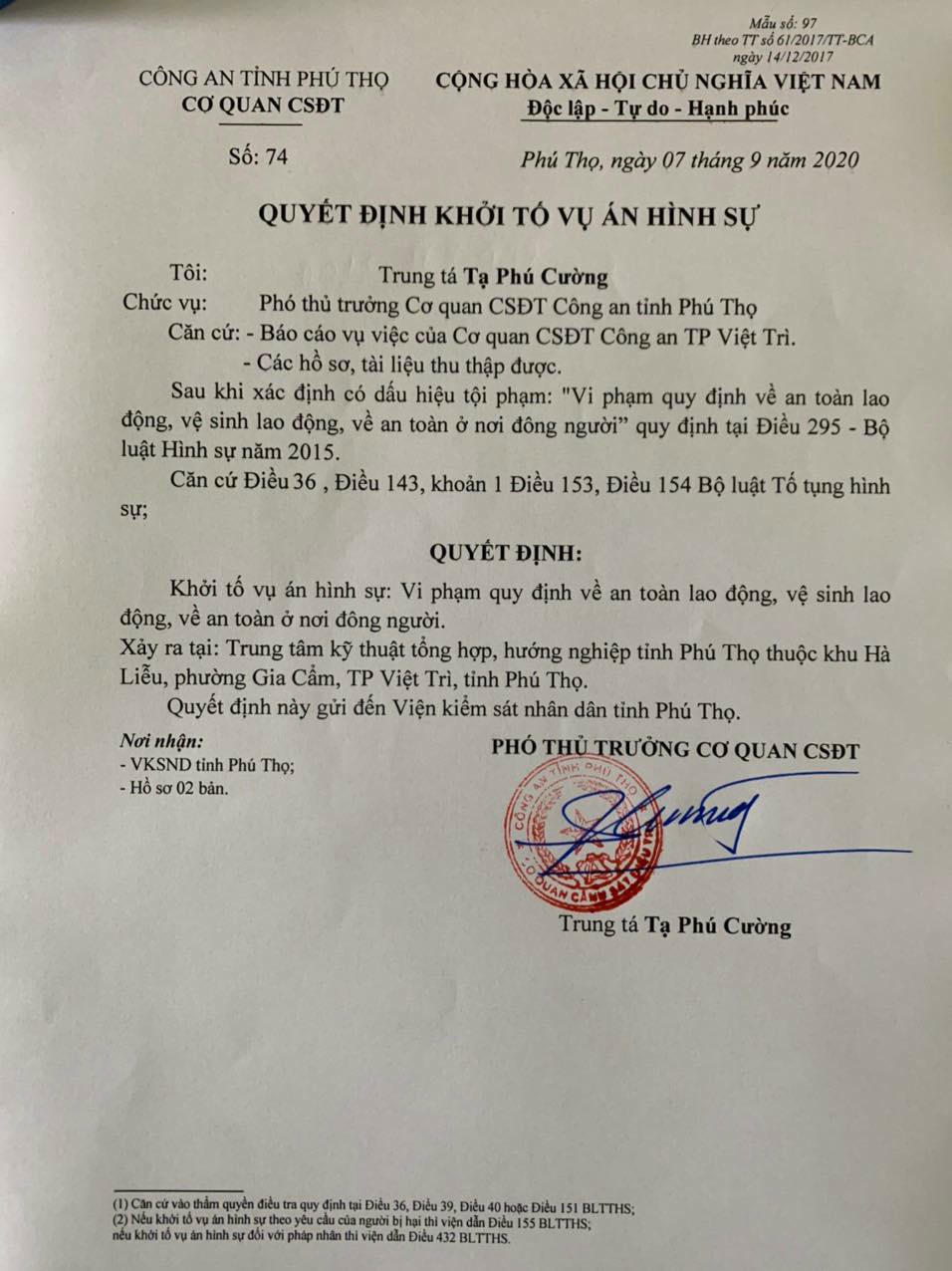 Căn cứ Điều 36, Điều 143, khoản 1 Điều 153, Điều 154; Điều 154 Bộ luật Tố tụng hình sự; ngày 7/9/2020, Cơ quan Cảnh sát điều tra Công an tỉnh Phú Thọ đã ra quyết định Khởi tố vụ án hình sự số 74: “Vi phạm quy định về an toàn lao động, vệ sinh lao động, về an toàn ở nơi đông người”.