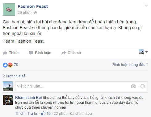 Nhưng trên Fanpage Fashion Feast, admin cũng chỉ đăng vỏn vẹn một lời xin lỗi: “Các bạn ơi, hiện tại hội chợ đang tạm dừng để hoàn thiện bên trong. Fashion Feast sẽ thông báo lại giờ mở cửa cho các bạn ạ. Không có gì hơn ngoài lời xin lỗi”.
