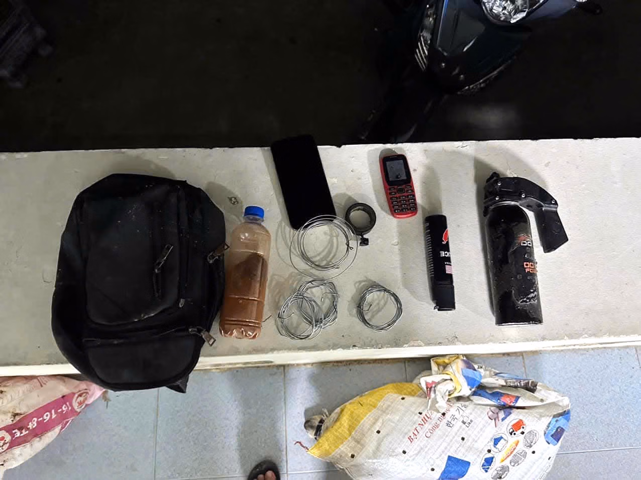 Kiểm tra tại hiện trường, lực lượng chức năng phát hiện trên người và phương tiện của các đối tượng có 3 con chó với tổng trọng lượng khoảng 49kg, cùng nhiều tang vật gồm: một biển số xe máy 73N1-7639, hai bình xịt hơi cay, một chai nhựa đựng ớt bột và bốn cuộn dây thép.