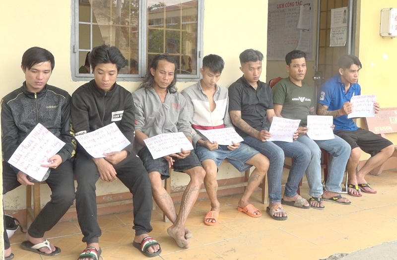 | Đinh Văn Tài (thứ 3 từ trái sang) cùng nhóm thanh niên lúc bị vây bắt về hành vi sử dụng trái phép chất ma túy. |