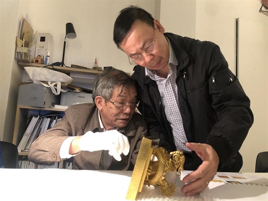 Các chuyên gia của Việt Nam nghiên cứu, đánh giá tính xác thực của ấn vàng Hoàng đế chi bảo tại hãng đấu giá Millon. Ảnh Cục DSVH |