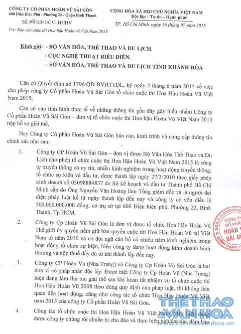 Chiều 16/7, nhà tổ chức của Hoa hậu Hoàn vũ Việt Nam là Công ty Cổ phần Hoàn vũ Sài Gòn (trụ sở tại 600 Điện Biên Phủ - Phường 22 – Quận Bình Thạnh – TP. HCM) đã có công văn báo cáo gửi Bộ VH,TT&DL, Cục Nghệ thuật Biểu diễn để cung cấp thông tin chính xác về sự việc trên.