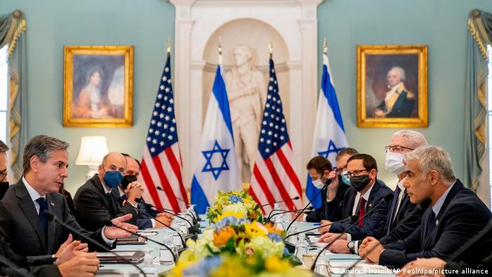 Ngoại trưởng Mỹ Anthony Blinken (phía trước) và Ngoại trưởng Iran Yair Lapid (phía trước) đã thảo luận về "các lựa chọn khác" ngoài ngoại giao để đưa Iran trở lại thỏa thuận hạt nhân năm 2015. Ảnh: AP (chụp ngày 13/10/2021)
