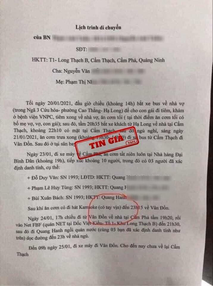 Ngày 28/1/2021, trên mạng xã hội lan truyền một văn bản kê khai thông tin về lịch trình của một người được cho là nhiễm COVID-19 tên là P.A.T ở Quảng Ninh, trong đó đáng chú ý là nội dung bệnh nhân khai đi hát Karaoke “tay vịn”.