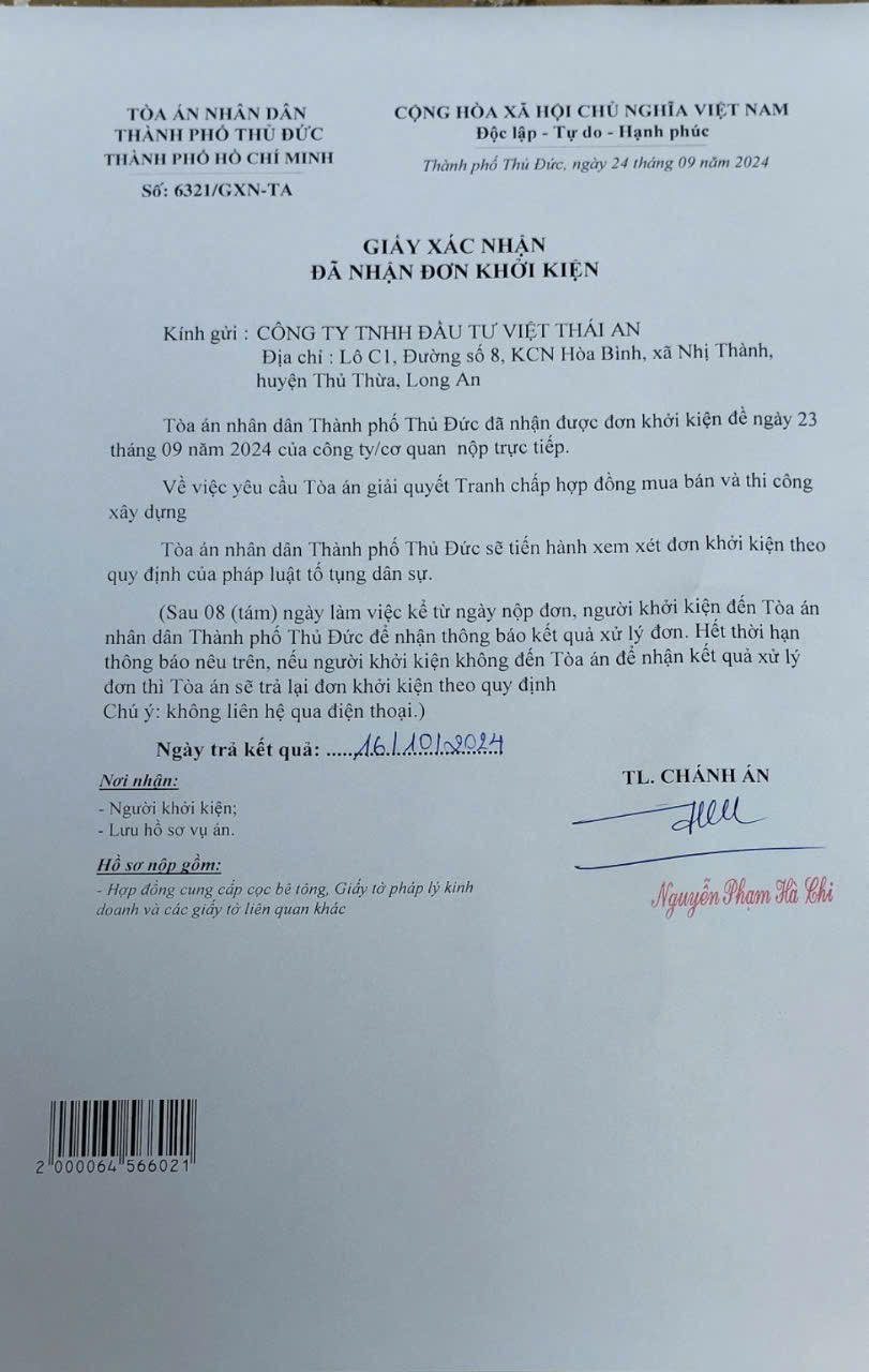 Được biết, ngày 24/09/2024, Tòa án Nhân dân TP Thủ Đức có Giấy xác nhận số 6321/GXN-TA gửi Công ty Việt Thái An với nội dung “sẽ tiến hành xem xét đơn khởi kiện theo quy định của pháp luật tố tụng dân sự” và hẹn ngày 16/10/2024 sẽ trả kết quả.