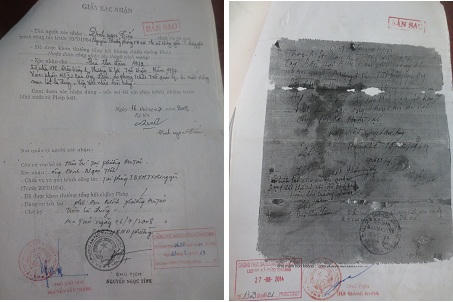 | Giấy xác nhận gia đình ông Lâm đã cho Ủy ban Hành chính thị xã Hưng Yên mượn đất (trái) và giấy xác nhận hồ sơ của ông Lâm bị mối xông |