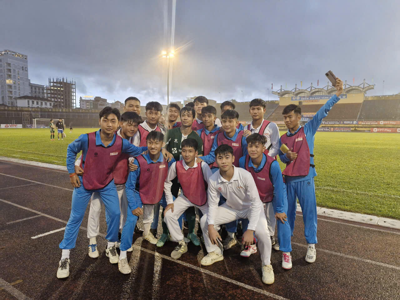Công Phượng chụp ảnh cùng với các cầu thủ trẻ của Huế và tác giả bài viết |