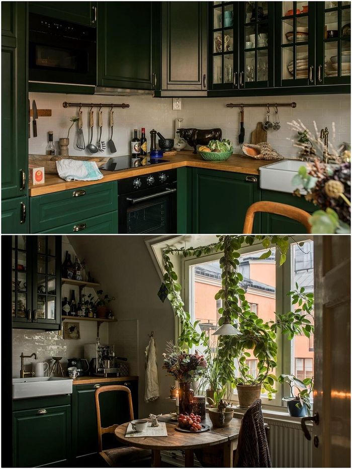 Căn hộ cũ cũng có những nét độc đáo riêng biệt mà tiêu biểu nhất chính là căn bếp màu xanh lá đậm. Lizzy cảm thấy gam màu xanh lá đậm rất thích hợp với nét đẹp cổ điển bên trong căn hộ của mình. Mỗi thiết kế trong căn phòng đều được cô nàng tận dụng triệt để, không bỏ phí một centimet nào.