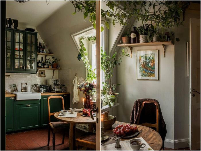 Bàn ăn tròn bằng gỗ tự nhiên được đặt tại một góc nhỏ bên trong căn bếp màu xanh lá đậm của Lizzy. Nằm ngay bên cửa sổ, được tô điểm với những chậu cây xanh, góc ăn uống mang đến cảm giác ấm cúng và thư giãn vô cùng.