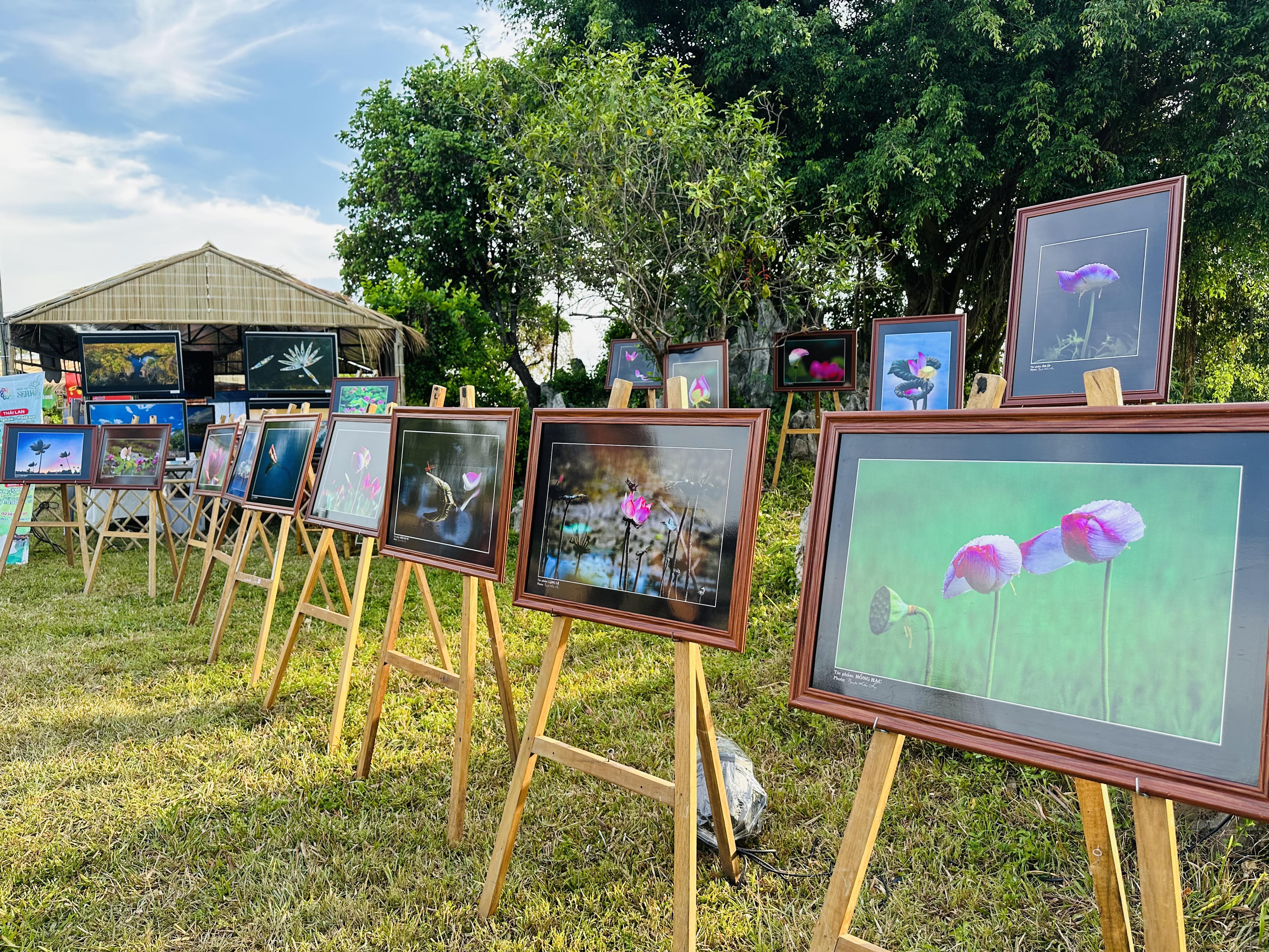 Các bức tranh về hoa sen được triển lãm tại ngày hội. |