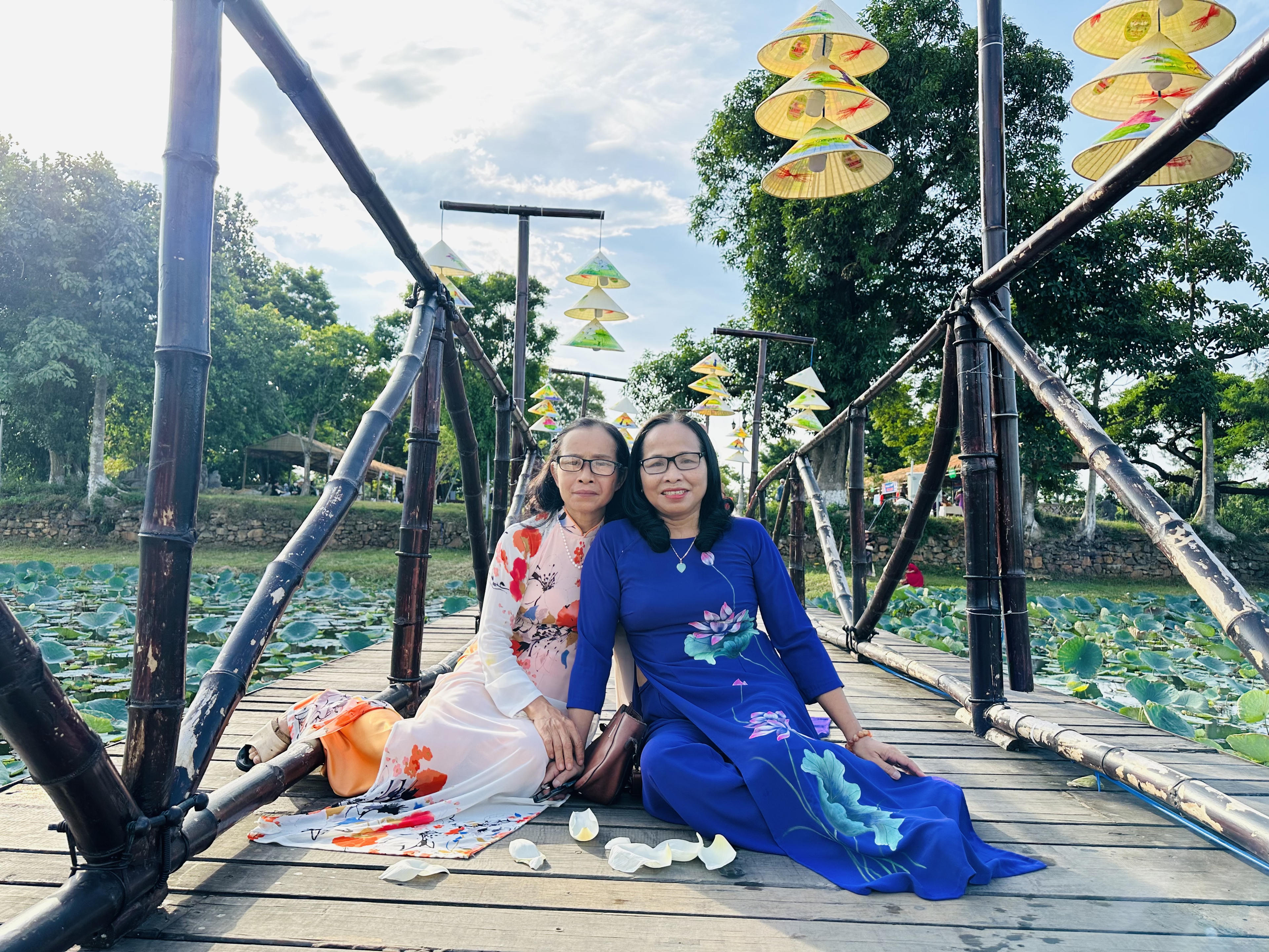 Nón lá sen được trang trí dọc lối đi rất bắt mắt. |