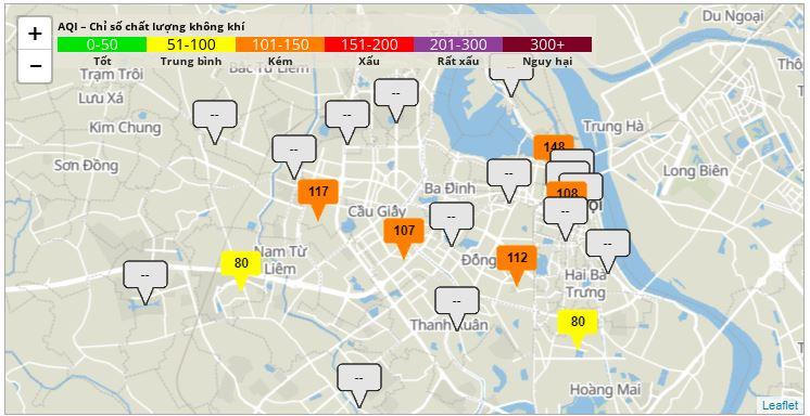 Cụ thể, trong 7 trạm đo thì có 5 trạm có chất lượng không khí (AQI) ở mức kém là: Mỹ Đình, Chi cụ Bảo vệ Môi trường, Kim Liên, Hoàn Kiếm, Hàng Đậu. Có 2 trạm đo có chất lượng không khí ở mức trung bình là Tây Mỗ và Tân Mai.