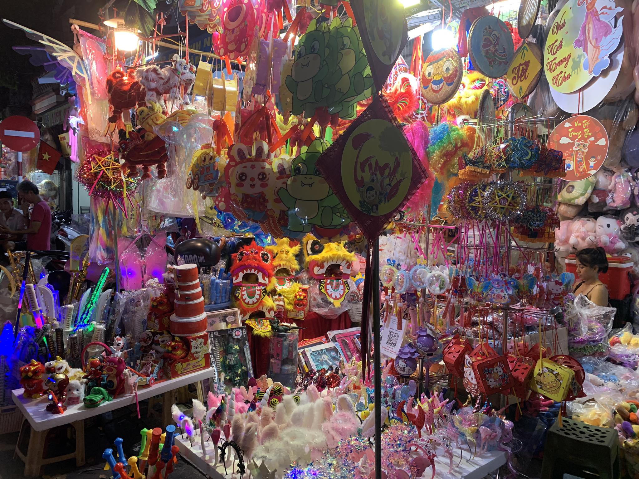 Đồ trang trí, đồ chơi trung thu, lồng đèn được bày san sát, rực rỡ sắc màu. |