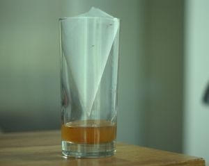 Đổ nước đường vào trong bình. Gấp tấm bìa cứng thành hình nón, để chừa 1 lỗ nhỏ đường kính 1cm ở chóp nón. Sau đó, bạn đặt nón lộn ngược chóp vào chiếc bình. Khi ngửi thấy mùi nước đường, ruồi sẽ bay vào và sớm bị chết chìm trong nước đường mà không thể thoát ra.