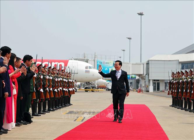 Tổng Bí thư, Chủ tịch nước Lào Thongloun Sisoulith chủ trì Lễ đón chính thức Chủ tịch nước Võ Văn Thưởng và Đoàn cấp cao Việt Nam tại Phủ Chủ tịch Lào. Lễ đón diễn ra trọng thể với sự có mặt của đông đảo người dân Thủ đô Vientiane trong những bộ trang phục truyền thống của nhân dân các dân tộc Lào vẫy cờ hai nước và những bông hoa rực rỡ trên tay, nồng nhiệt chào mừng Chủ tịch nước Võ Văn Thưởng và Đoàn cấp cao Việt Nam thăm chính thức Lào.