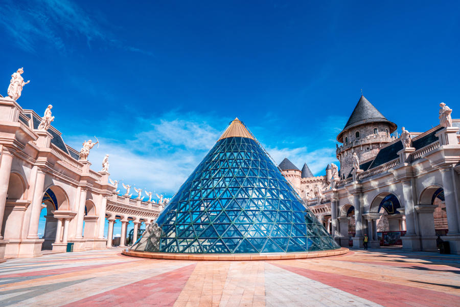 Ấn tượng nhất là tòa tháp kính hình chóp khổng lồ mang phong cách kiến trúc độc đáo dễ khiến du khách liên tưởng đến Bảo tàng Louvre lừng danh. Đặc biệt, khu vực này cũng nổi bật với vườn tượng 20 tác phẩm điêu khắc các nữ thần quan trọng nhất trong thần thoại Hy Lạp như: Hestia - thần của bếp lửa, Hebe - nữ thần của tuổi trẻ, con gái út của Zeus và Hera; Artemis - nữ thần săn bắn, chị em sinh đôi của Apollo, người được kính trọng bậc nhất của Hy Lạp cổ đại…