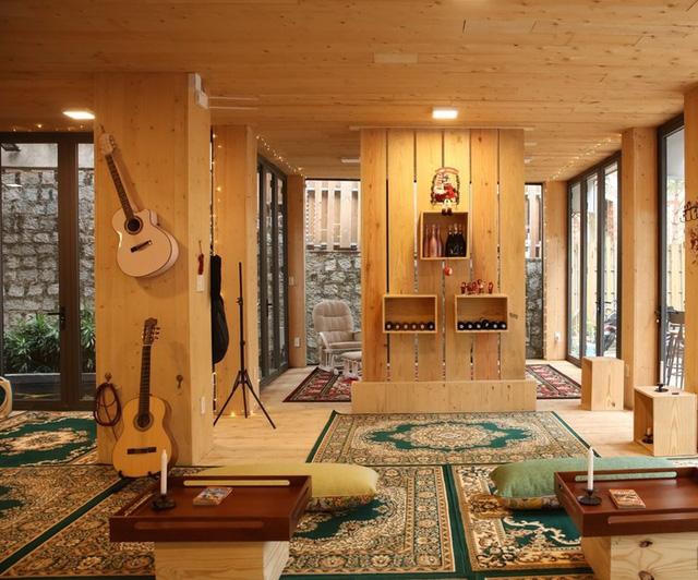 Căn biệt thự gồm 3 tầng: tầng trệt được bố trí như một phòng khách lớn, là nơi để mọi người có thể ngồi thư giãn. Ban công tầng hai có thiết kế sân khấu nhỏ để mọi người có thể thưởng thức âm nhạc và hút thở không khí trong lành của Đà Lạt về đêm. Tầng ba là không gian mở với ánh sáng vàng lãng mạn nhưng cũng rất ấm cúng.