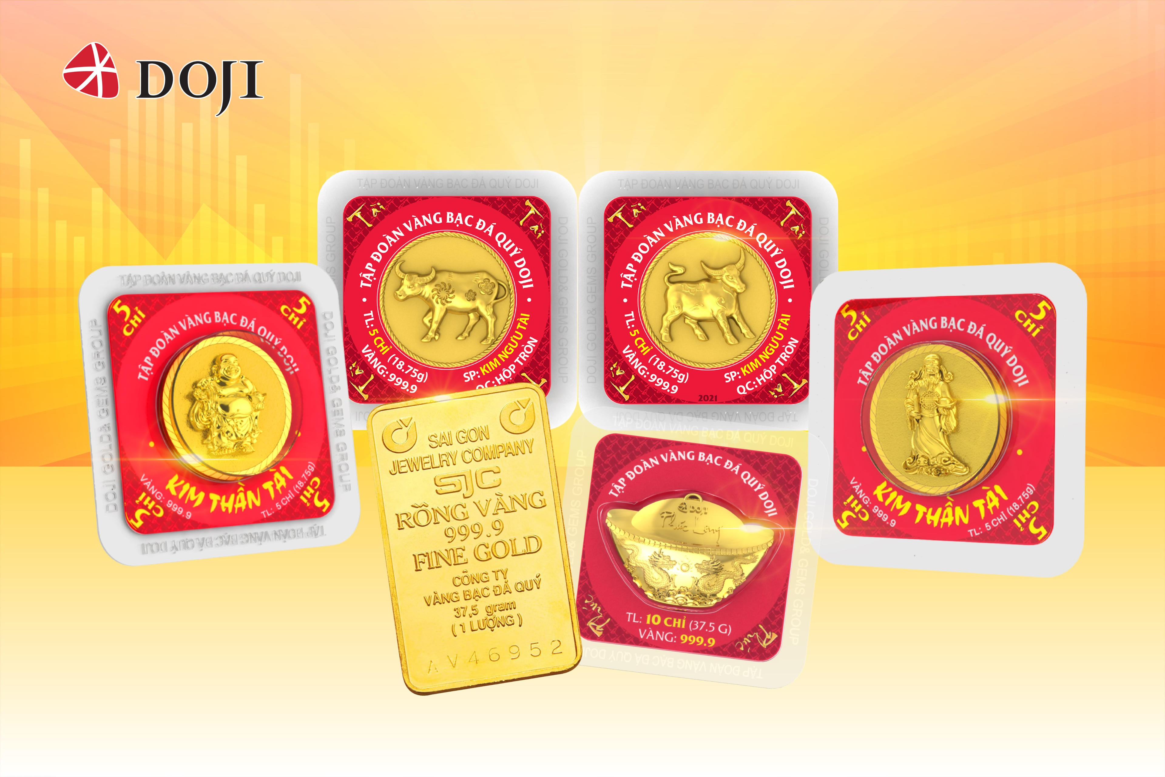 Khách hàng có thể lựa chọn các loại vàng miếng, vàng ép vỉ của DOJI có hàm lượng vàng 999.9 đạt chuẩn, gây sốt thị trường trong ngày Thần Tài như: Vàng ép vỉ Âu vàng Phúc Long, Vàng ép vỉ Lộc Phát Tài, Vàng ép vỉ Hưng Thịnh Vượng, với trọng lượng 1 chỉ, 2 chỉ, 5 chỉ, 10 chỉ của Tập đoàn Vàng bạc Đá quý DOJI; hay vàng miếng SJC truyền thống.