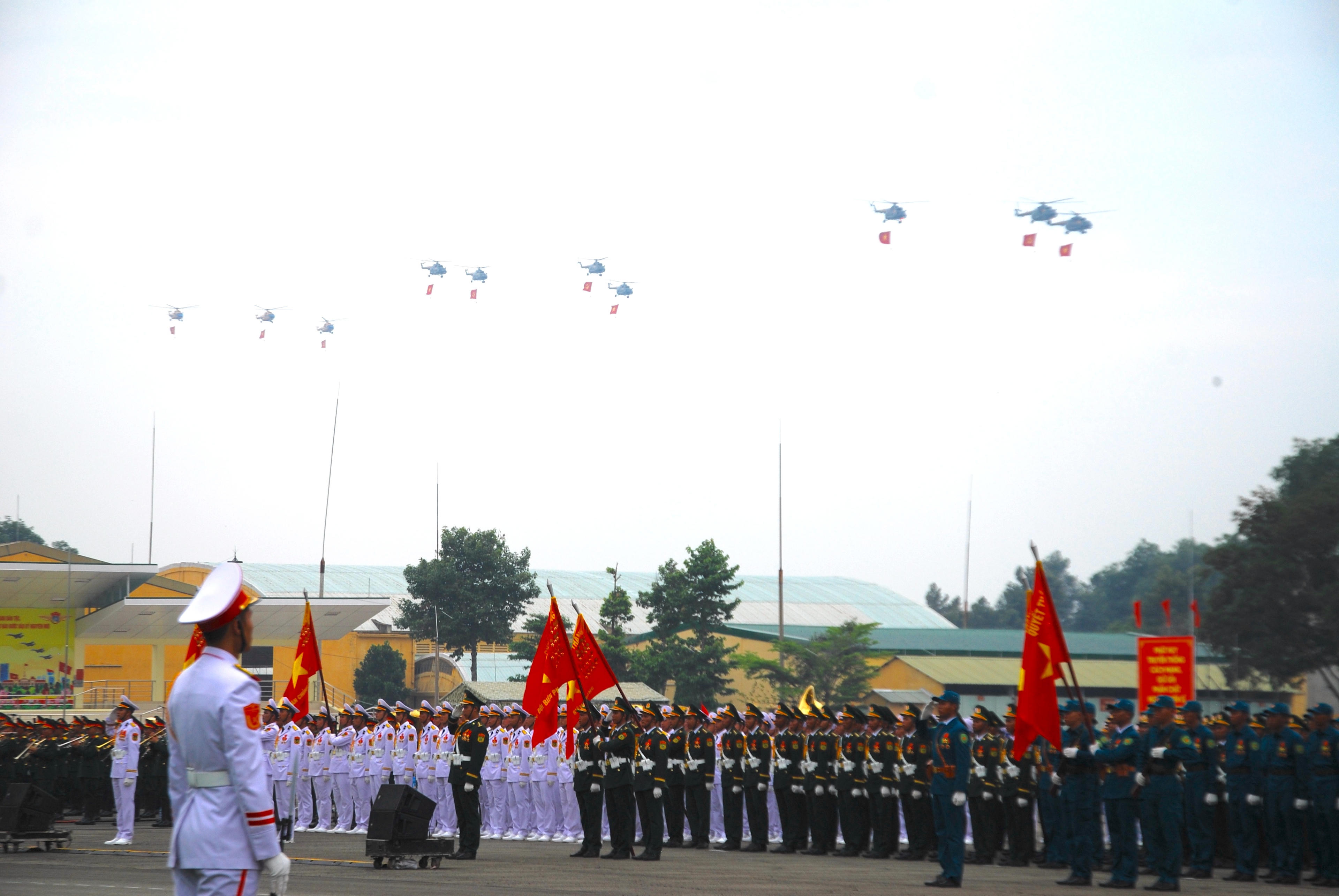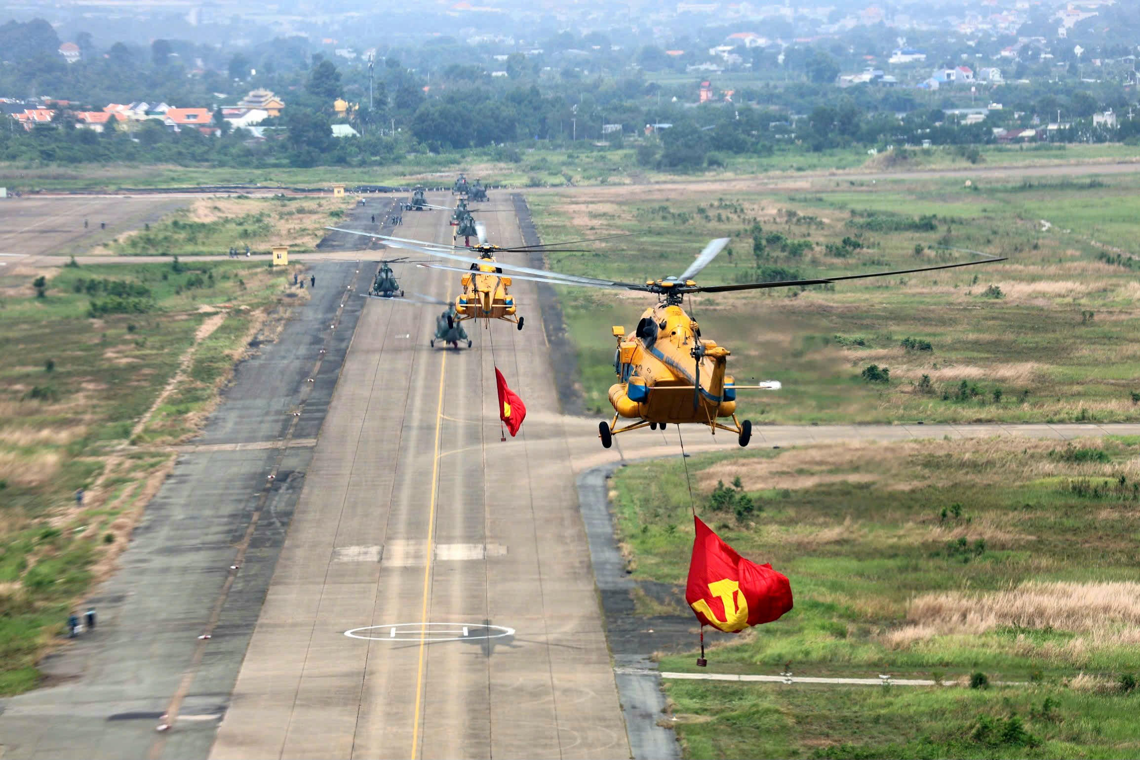 Trực thăng Mi-8, Mi-17 bay theo đội hình 3-4-3 xuất phát từ Sân bay Biên Hoà hướng về TP Hồ Chí Minh. |