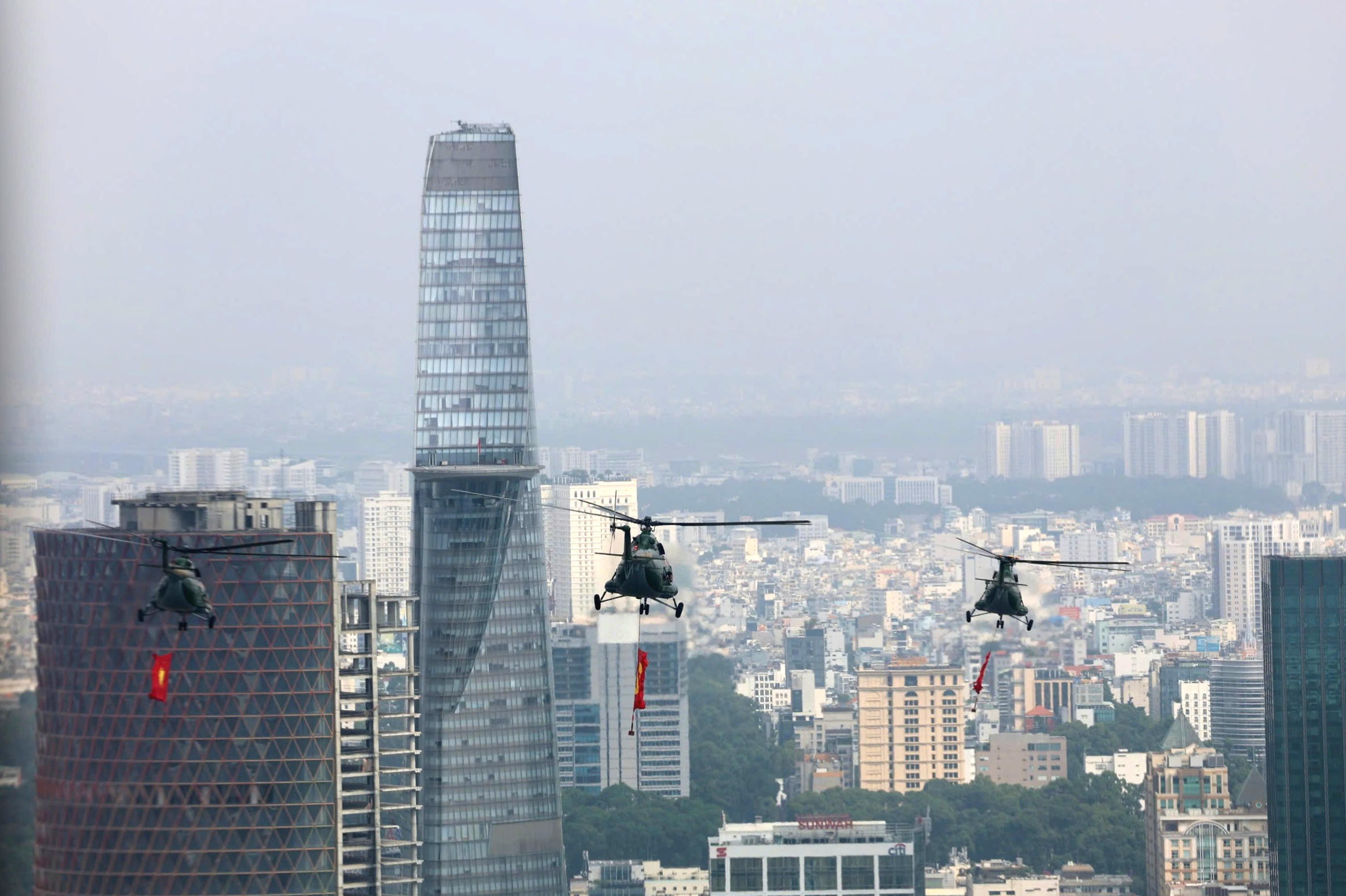 Các máy bay thực hiện các màn trình diễn diễu binh trên không bay qua toà nhà Bitexco, phường Bến Nghé, Quận 1. |