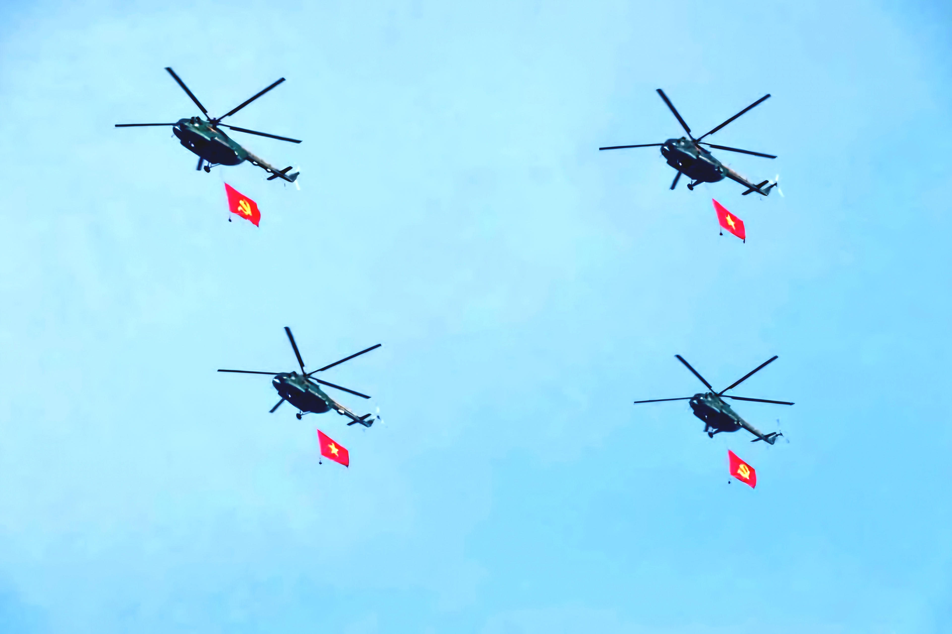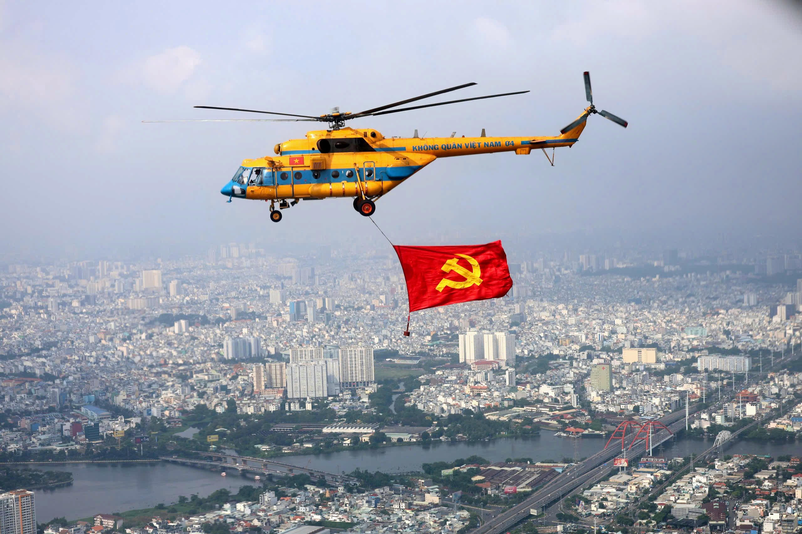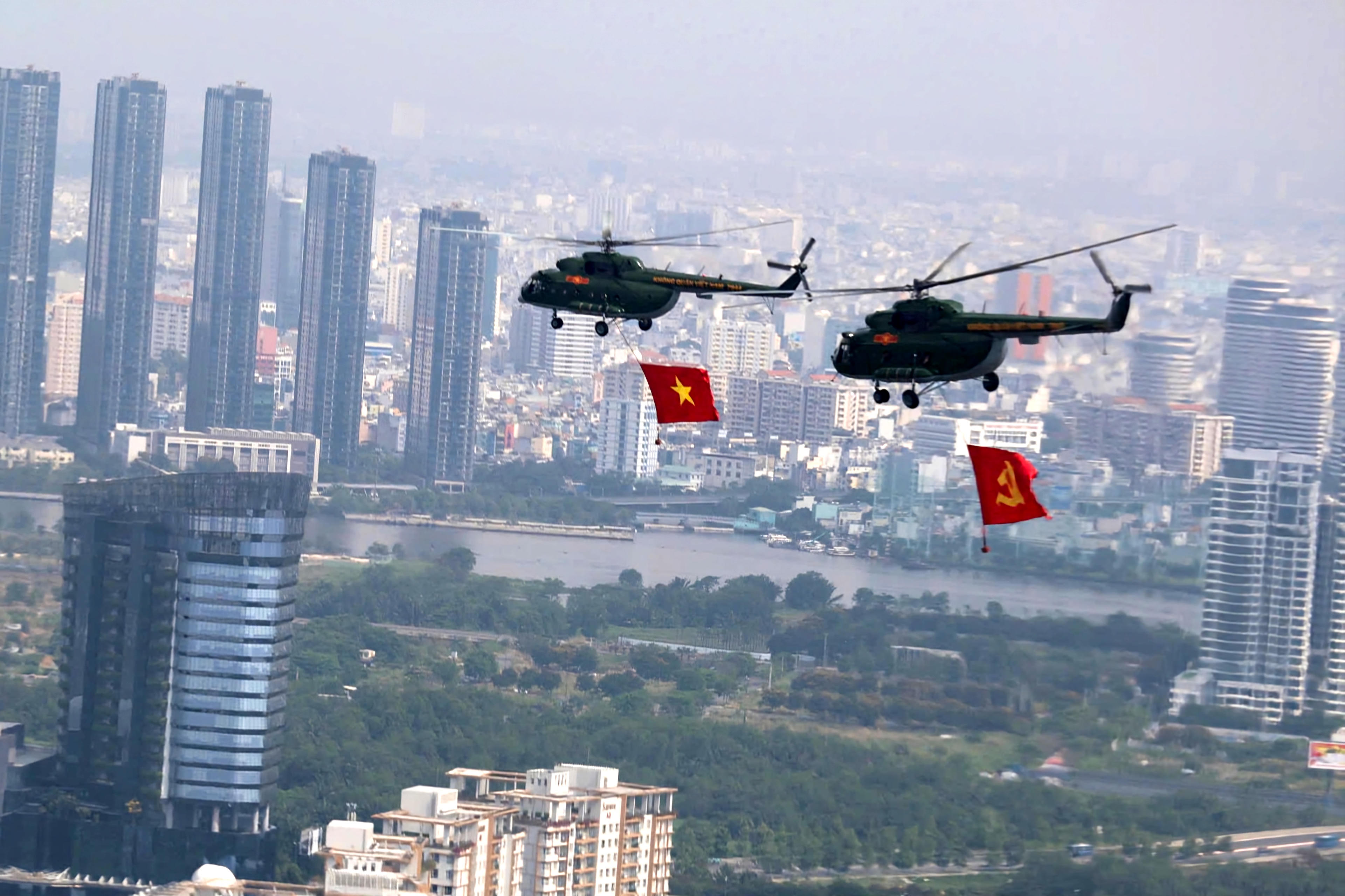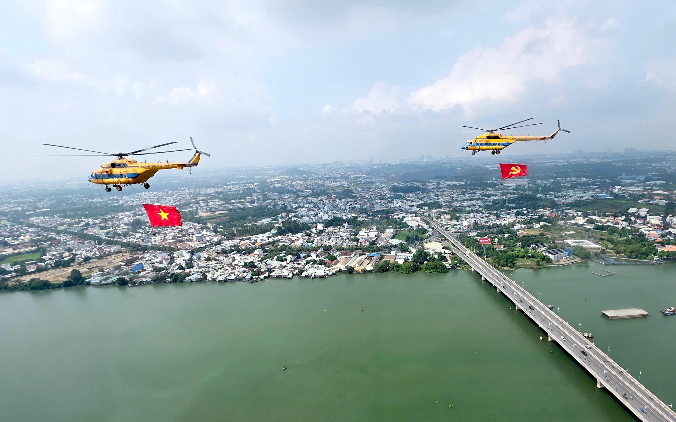 Các trực thăng thực hiện bài bay kéo cờ Đảng và cờ Tổ quốc dọc sông Sài Gòn. |