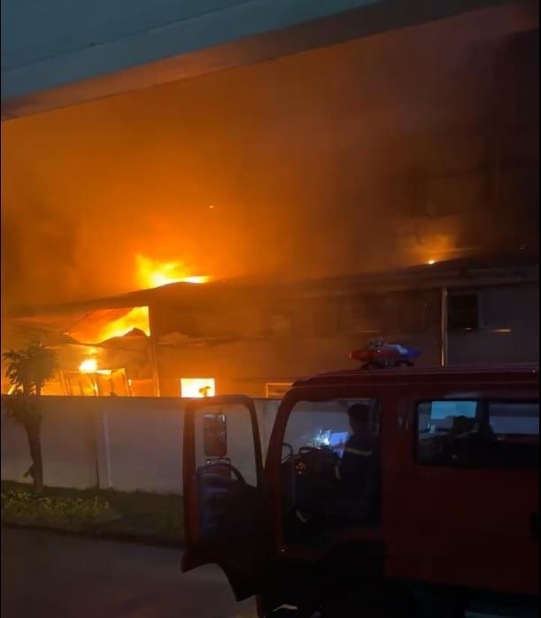 Tại hiện trường, ngọn lửa ngùn ngụt bốc cháy, bao trùm hơn 1.000m² nhà xưởng của công ty. Lực lượng chữa cháy nhanh chóng điều động tiếp cận đám cháy, phun nước dập lửa từ nhiều phía.
