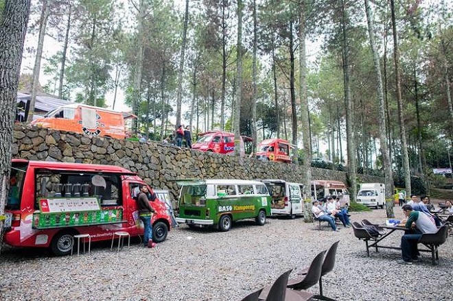 Bàn ghế ngồi nghỉ ngơi, ăn uống thì thoáng mát, sạch sẽ. Những chiếc xe minivan sơn đủ màu sắc đậu nối đuôi nhau ngay bãi đất trống bán đủ thứ đồ ăn vặt, nước uống tạo khung cảnh như đang đi cắm trại giữa rừng.