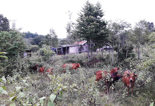 Tiến vào sâu một chút, trước mặt PV bất ngờ xuất hiện đàn bò chừng 15 con phóng uế bừa bãi, bốc mùi hôi hám. Tiến vào sâu, thấy có căn nhà nhưng không có người ở mà là nơi để nuôi gà, vịt.
