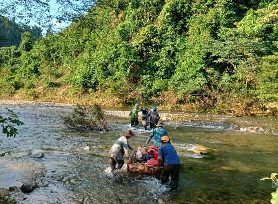 Công nhân viễn thông vượt suối đến khu vực để triển khai lắp cột phát sóng. |