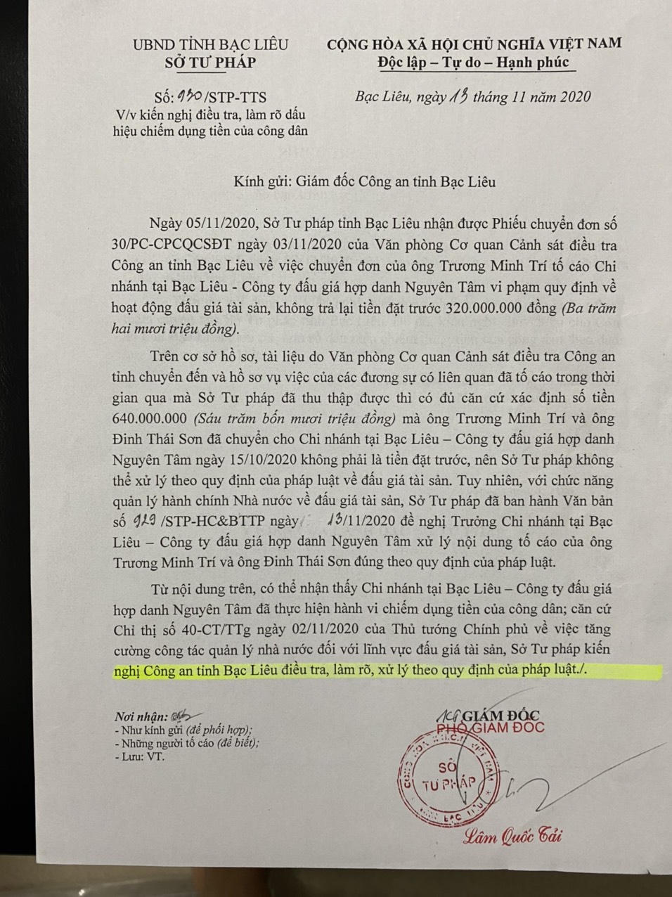 Văn bản của Sở Tư pháp Bạc Liêu chỉ rõ: “Từ nội dung tố cáo của công dân, có thể nhận thấy Chi nhánh Bạc Liêu - Công ty Đấu giá hợp danh Nguyên Tâm đã thực hiện hành vi chiếm dụng tiền của công dân; căn cứ Chỉ thị số 40 ngày 2/11/2020 của Thủ tướng Chính phủ về việc tăng cường công tác quản lý nhà nước đối với lĩnh vực đấu giá tài sản, Sở Tư pháp kiến nghị Công an tỉnh Bạc Liêu điều tra, xử lý theo quy định của pháp luật”.